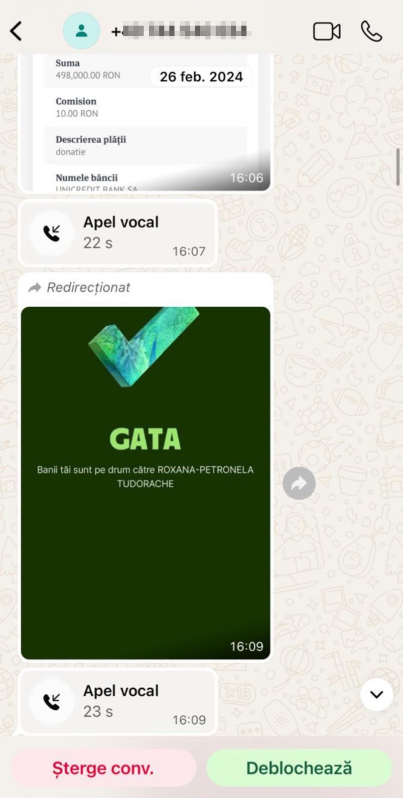 Dovada falsificată a transferului bancar pentru Roxana