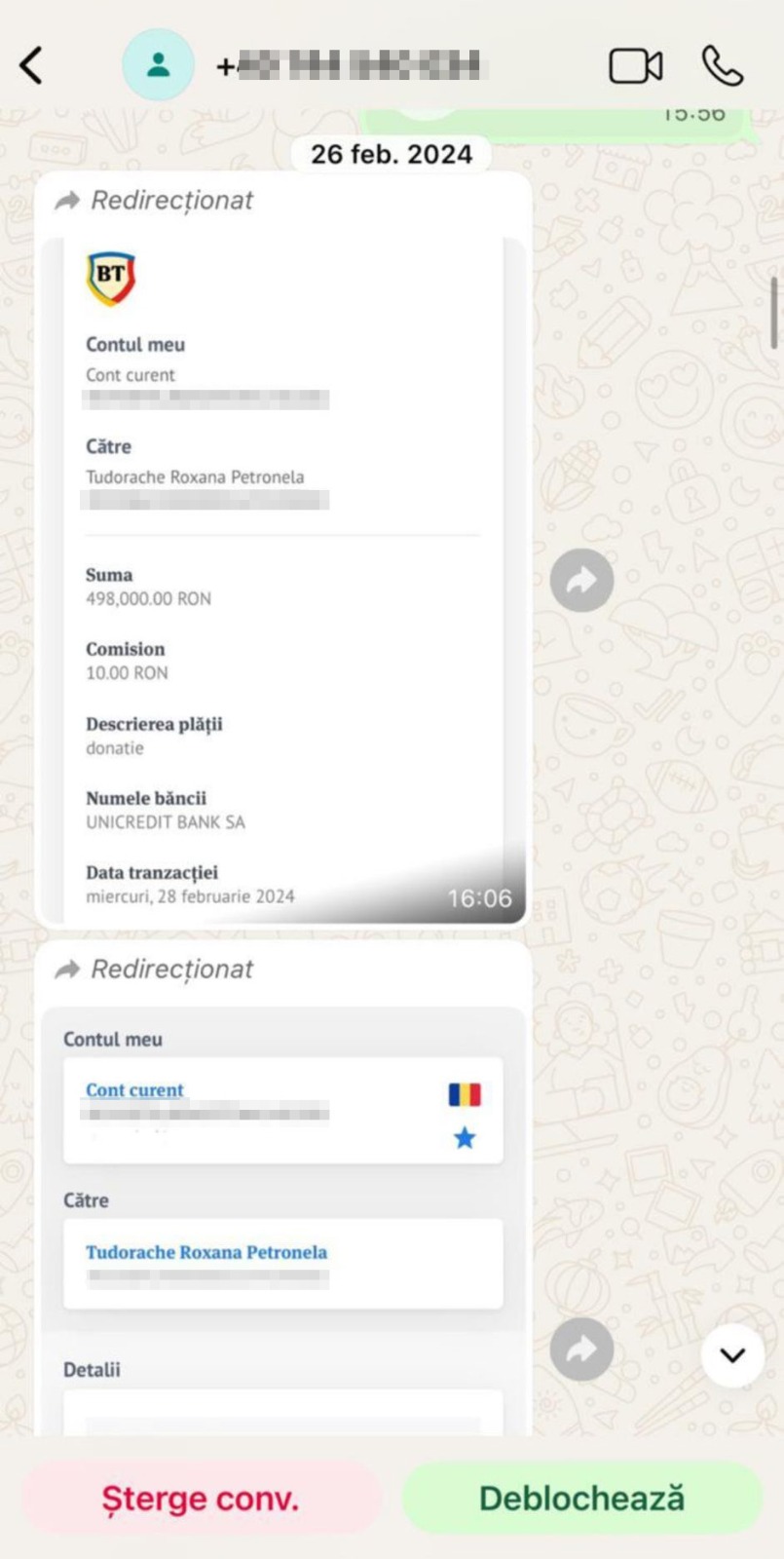 Dovada falsificată a transferului bancar pentru Roxana