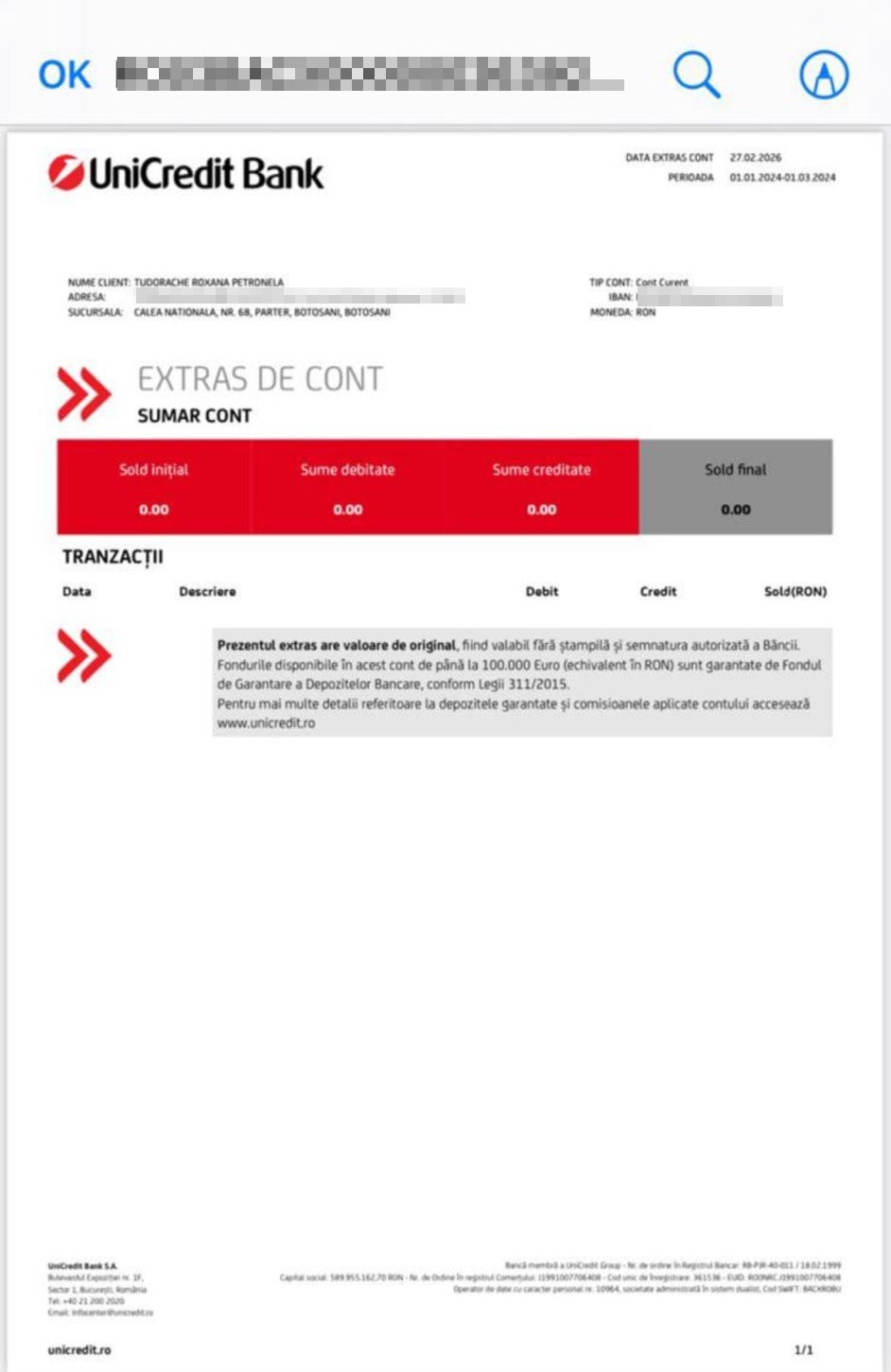Dovada falsificată a transferului bancar pentru Roxana