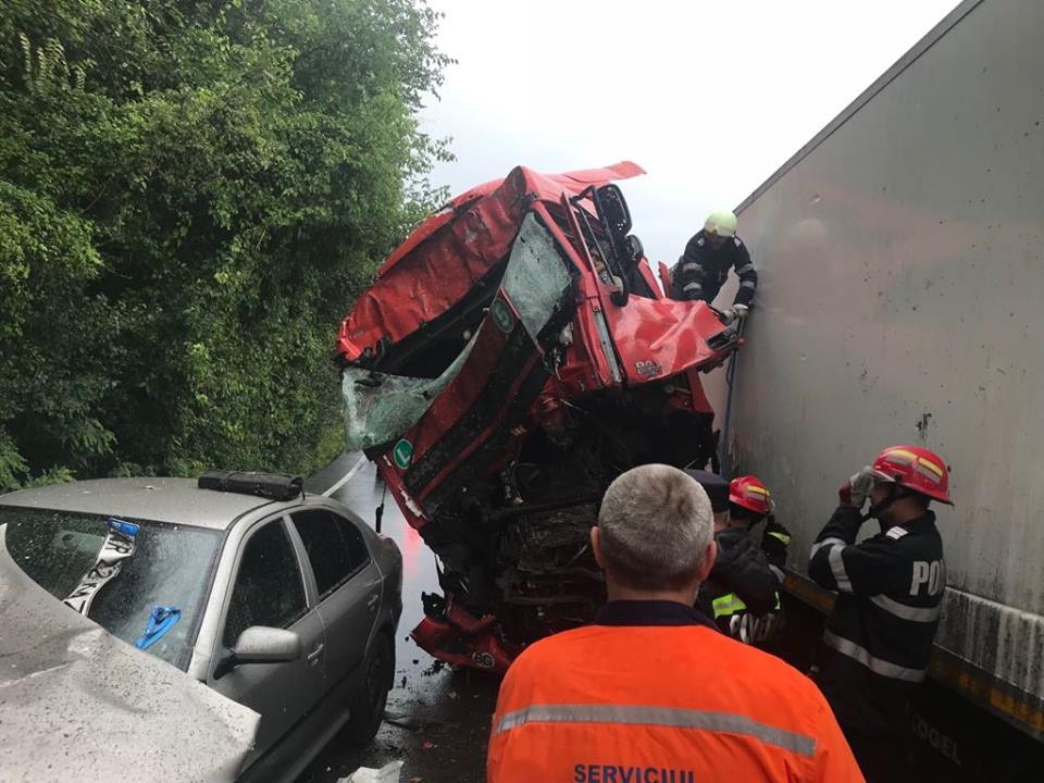 FOTO. Accident violent cu două TIR-uri şi un autoturism. Unul dintre şoferi, în stare gravă