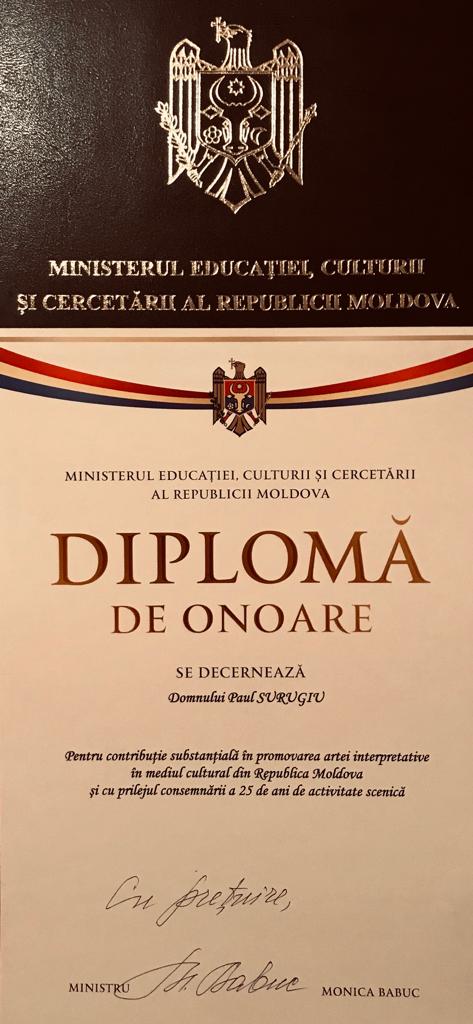 Ministerul Culturii Republicii Moldova i-a decernat lui Paul Surugiu o distincție de onoare pentru contribuția deosebită adusă muzicii și pentru cei 25 de ani carieră