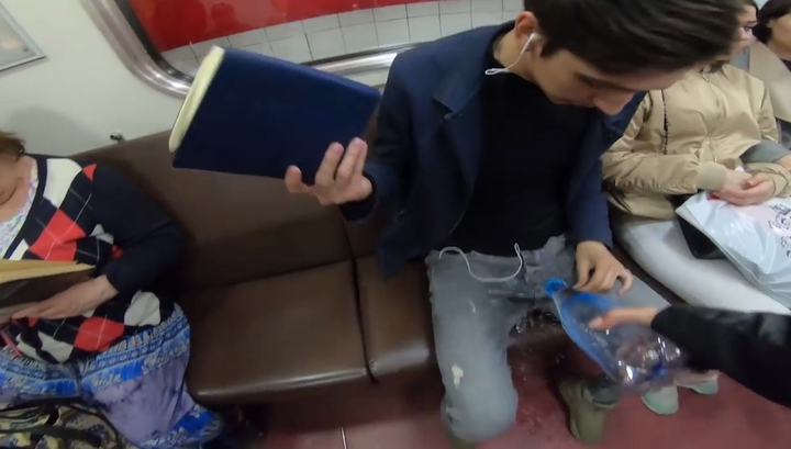 Gest incredibil! Un fotomodel aruncă cu apă și înălbitor pe bărbații de la metrou