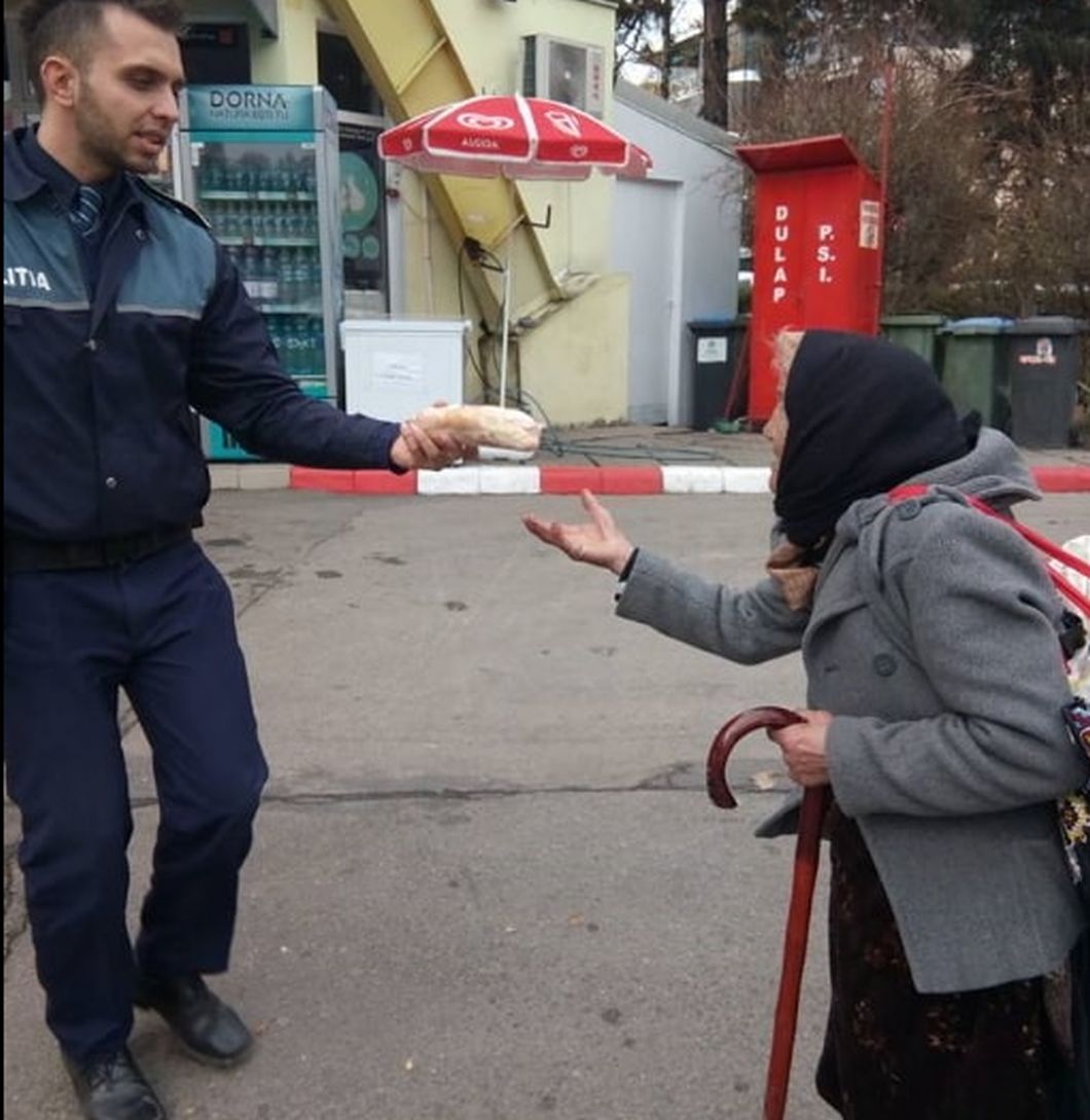 Gestul unui polițist din Cluj față de o bătrână care plângea de foame în fața unei benzinării a ajuns viral pe Internet! Ce a făcut omul legii
