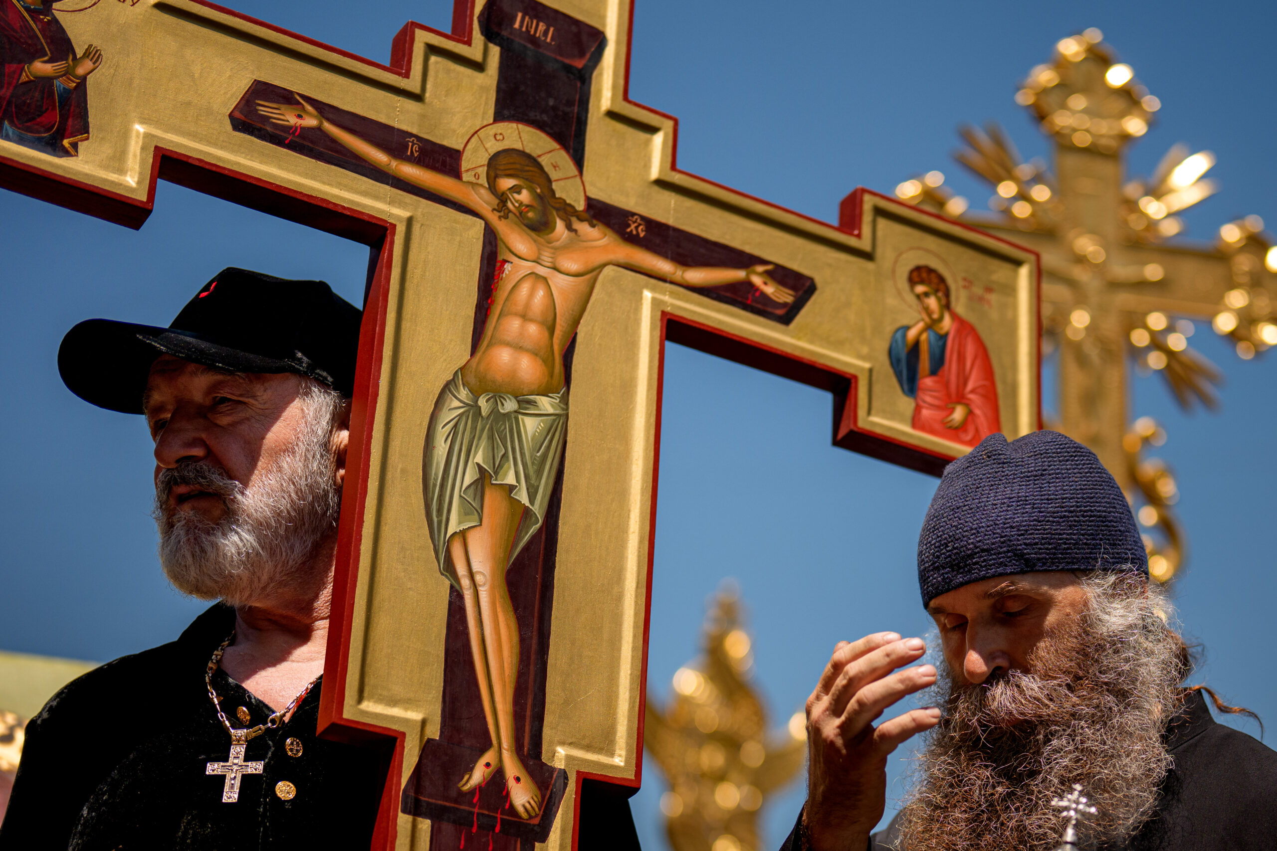Gigi Becali tine o cruce in timpul unei contramanifestatii organizate de asociatia ''Fratia Ortodoxa'' fata de marsul comunitatii LGBTQ+ ''Bucharest Pride 2025'', in Bucuresti, duminica, 8 iunie 2025. Aproximativ 100 de persoane purtand cruci, icoane si agheasma au participat, duminica, la un mars de ''izgonire a duhurilor necurate lasate in urma de parada LGBTQ'' conform organizatorilor, pe acelasi traseu ca participantii la Bucharest Pride 2025. ANDREEA ALEXANDRU / MEDIAFAX FOTO
