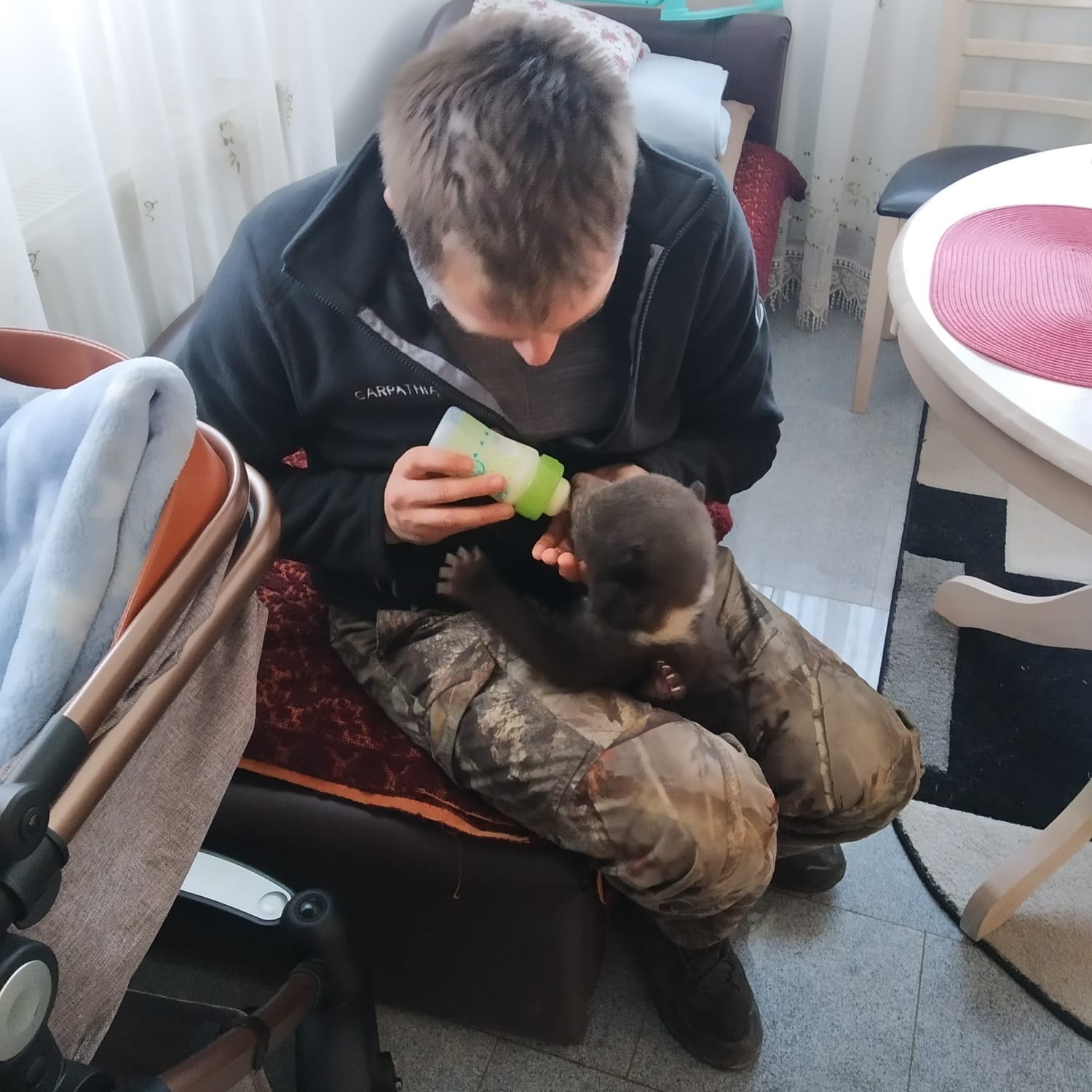 Imagini emoționante. Pui de urs nou-născut, salvat din mijlocul unei exploatări forestiere. FOTO