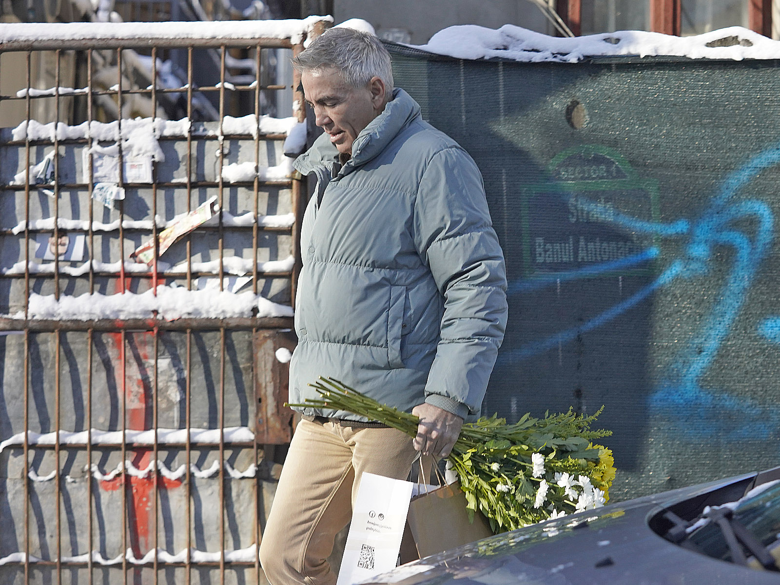 A ieșit de acolo cu un buchet elegant de flori albe și galbene