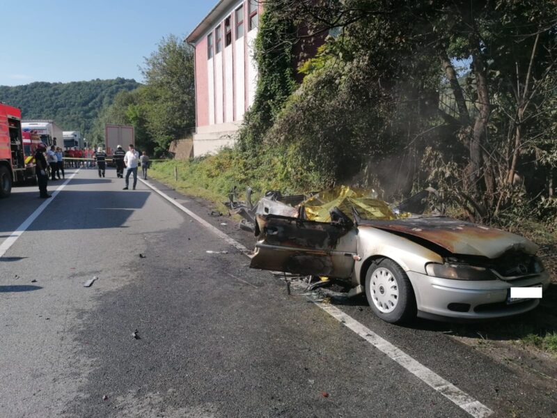 Impact violent urmat de un incendiu, între un TIR și un autoturism în Mehedinți. Două persoane au murit pe loc. FOTO