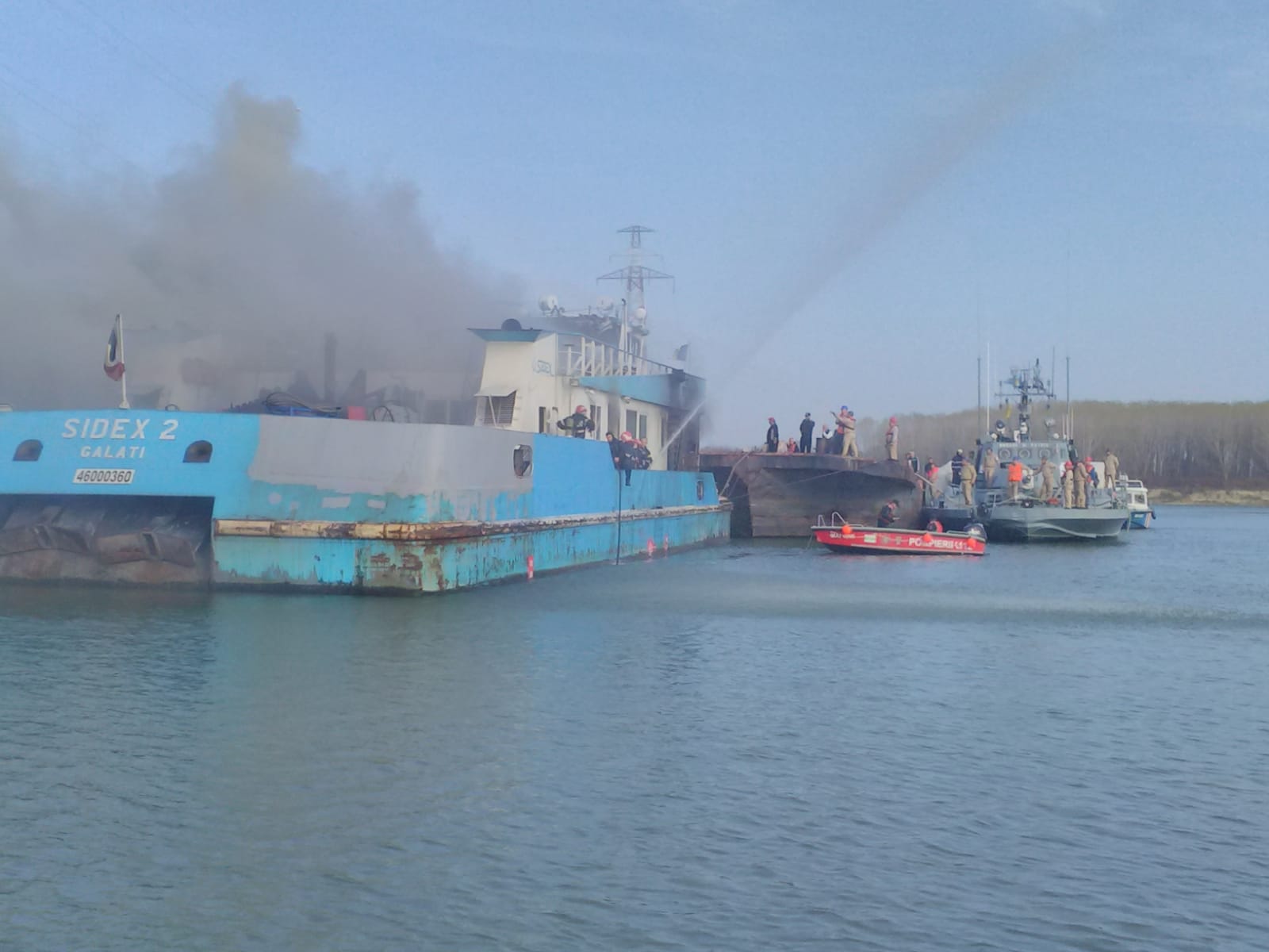 Incendiu puternic pe Dunăre, la o barjă cu bauxită. Pompierii s-au luptat minute în șir cu flăcările
