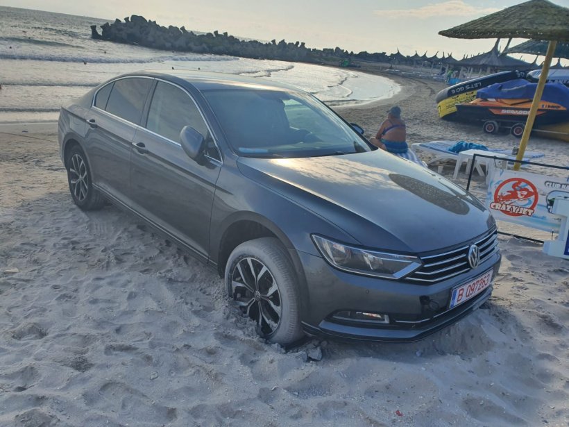 Incredibil! Imagini cu mașina unui turist parcată pe plajă, printre șezlonguri, în Saturn. Salvamarii au sunat la poliție