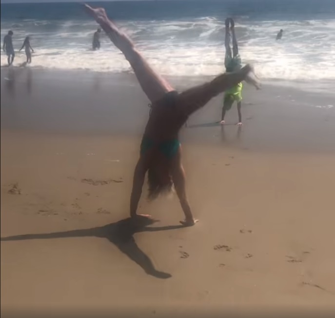 Cu ocazia împlinirii a 43 de ani de la istoria scrisă de Nadia Comăneci la Jocurile Olimpice de la Montreal, fosta campioană a făcut roata pe o plajă © Facebook