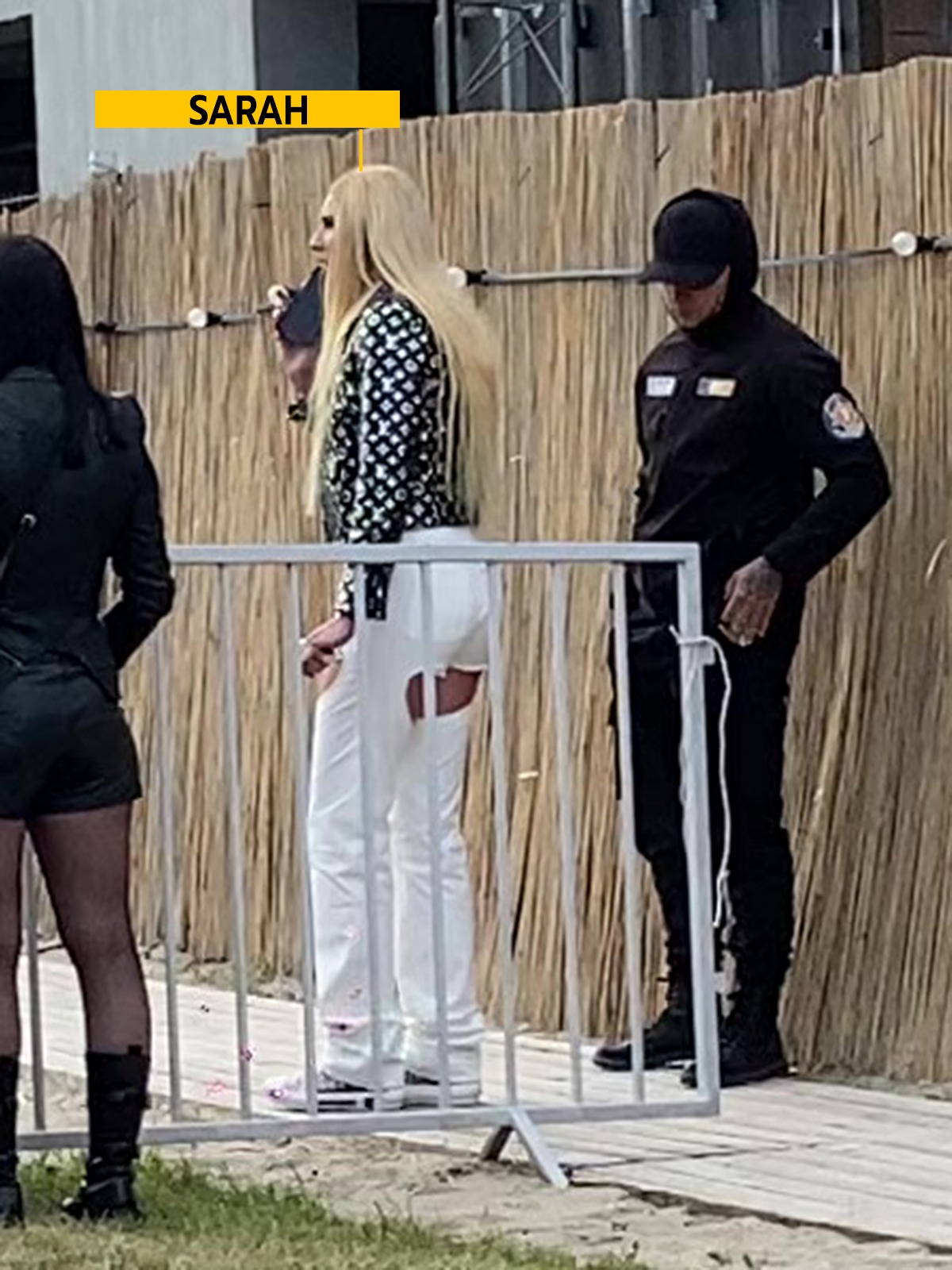 Sarah vorbește la telefon, la intrarea de la LOFT