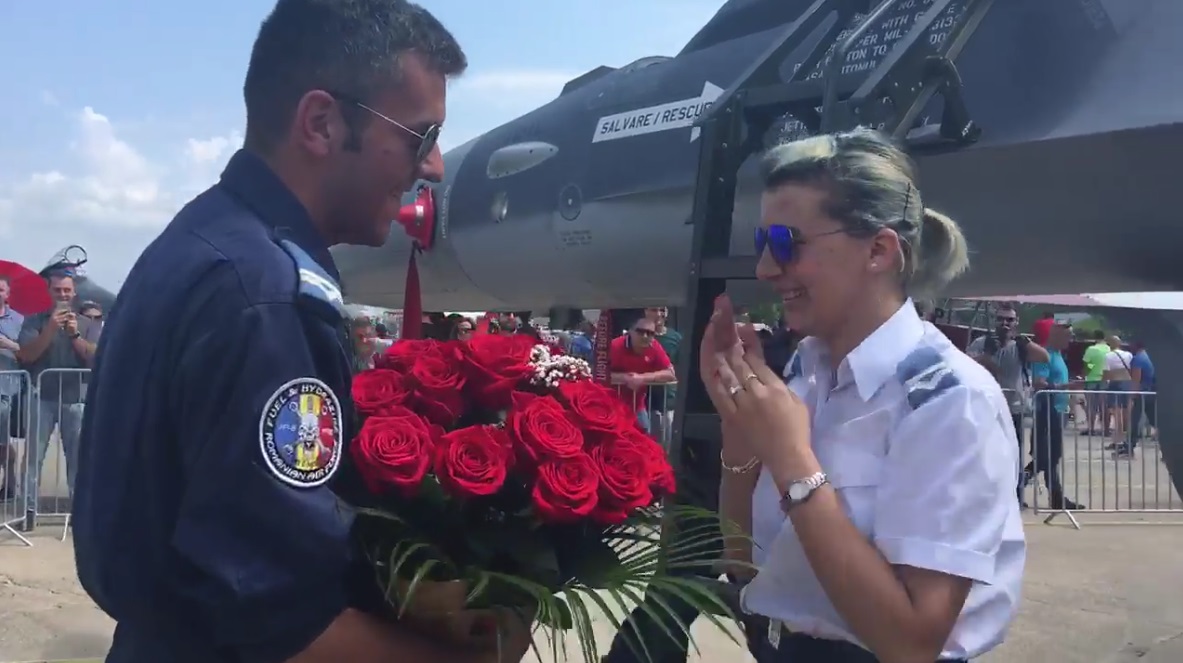 Lacrimi și emoții la BIAS 2018! Un angajat al Forțelor Aeriene Române a îngenuncheat și a cerut-o de soție pe iubita lui