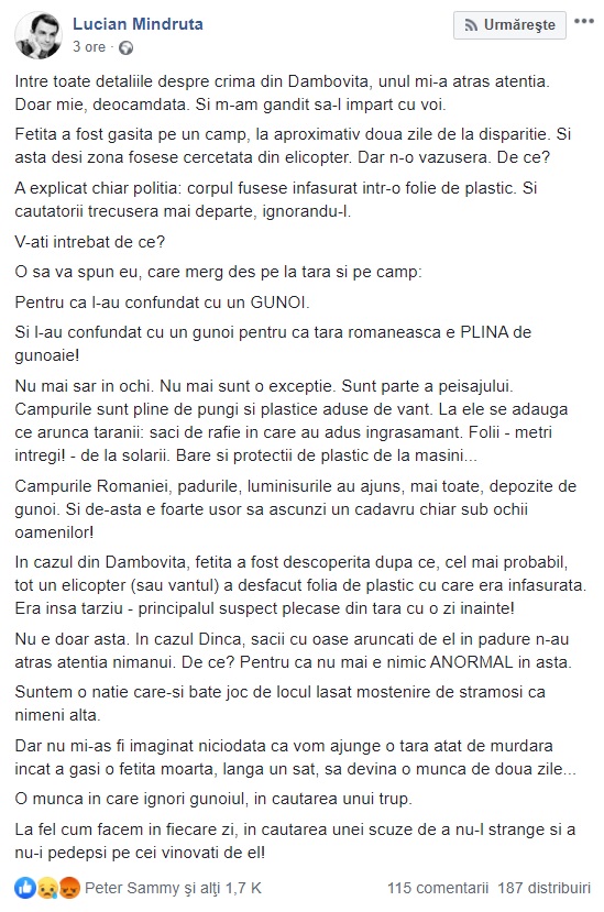 Lucian Mîndruță, reacție tranșantă în cazul crimei minorei din Dâmbovița! Ce a spus despre greșeala formidabilă a polițiștilor
