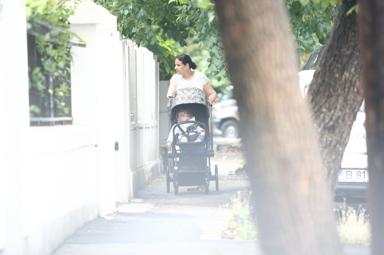 Mama Mădălinei Ghenea își plimbă nepoata prin fața palatului din Primăverii