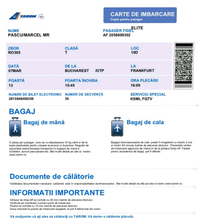 Marcel Kalu ne-a trimis biletul de avion de la București la Frankfurt, datat 7 martie