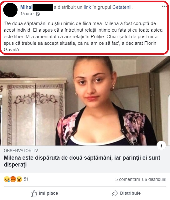 Milena Gavrilă are 14 ani și a dispărut de mai bine de două săptămâni. Explicația halucinantă oferită tatălui ei de un polițist