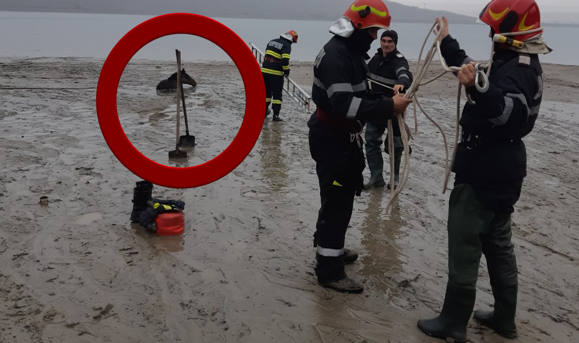 Misiune dificilă și inedită pentru pompierii din Argeș. Au salvat un cal „îngropat” în mâl – VIDEO
