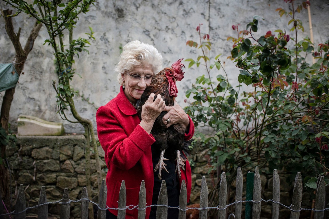 France rooster dispute in Oleron, Corinne Fesseau and her rooster Maurice, in the garden of her house in Saint-Pierre d’Oléron where she lives since several years with her husband, fisherman who was born on the island. Saint-Pierre d’Oléron, France, 13/06/2019 Kasia Strek for the New York Times