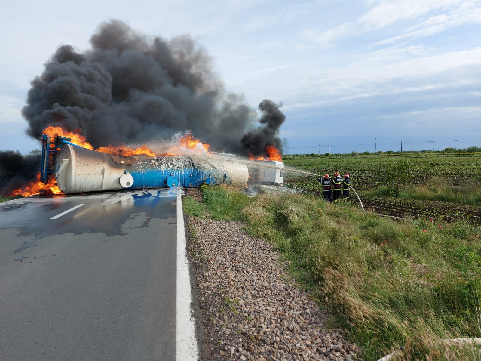 O cisternă cu motorină s-a răsturnat pe DN 21A și a luat foc. Traficul este blocat în totalitate, iar șoferul a scăpat doar printr-o minune