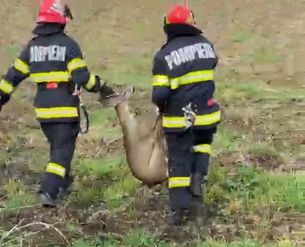 Operațiune de salvare emoționantă! Pompierii din Arad au scos o căprioară care era captivă într-un canal