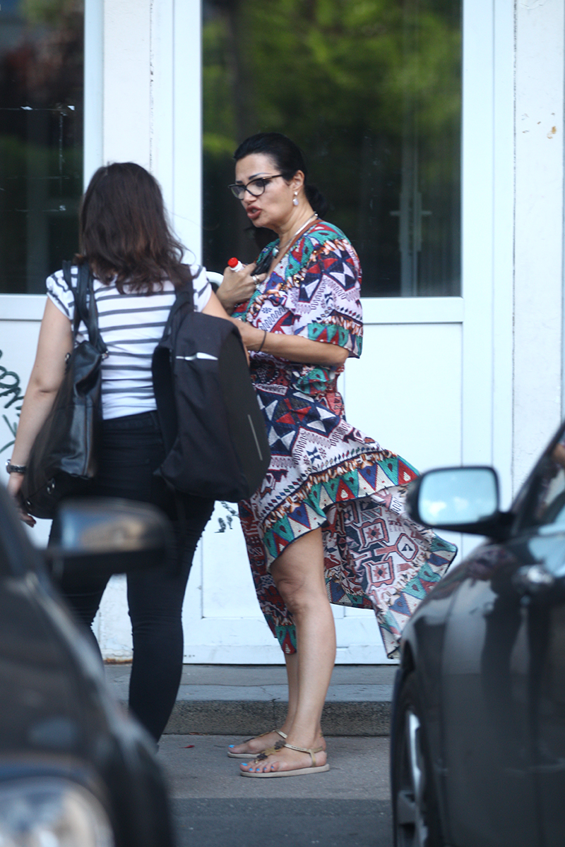 Ozana și prietena ei vorbesc în fața scării de bloc unde soprana locuiește