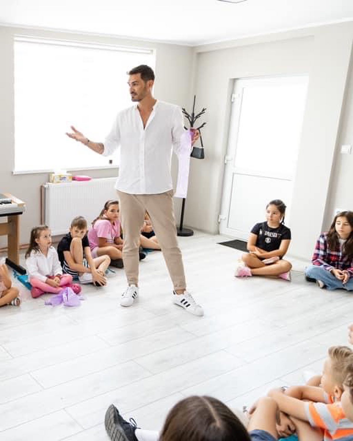 George Burcea, în compania micuților atrași de misterele profesiei de actor / Sursă foto: Facebook