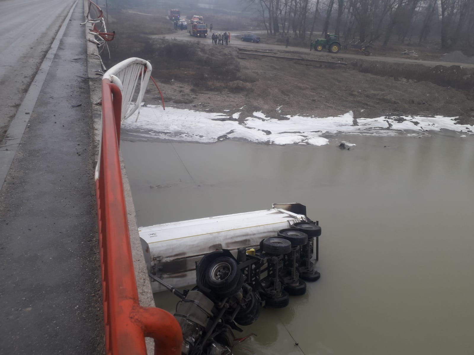 Șoferul nu a mai putut controla camionul din cauza poleiului și a plonjat cu el, de pe pod, în râu