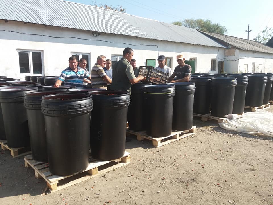 Măceșele sunt adunate în recipiente uriașe