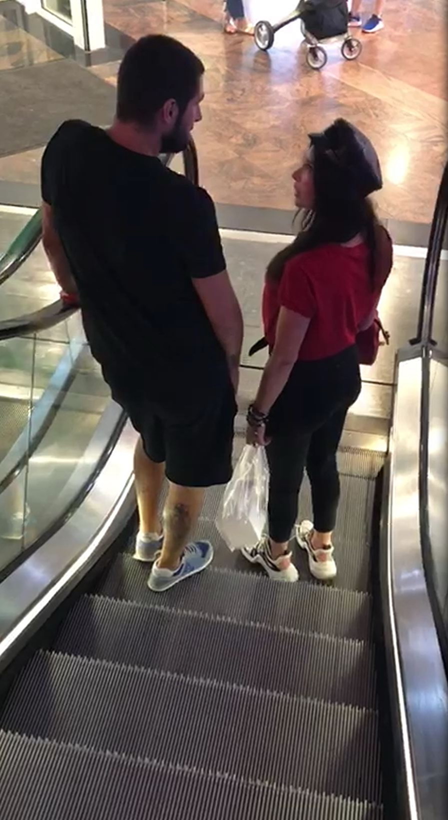 Cătălin discută cu Roxana, pe scara rulantă