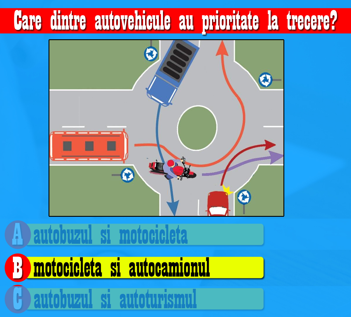Test auto pentru șoferi, cu 10 chestionare | Primul: Care dintre cele 4 autovehicule au prioritate la trecere?