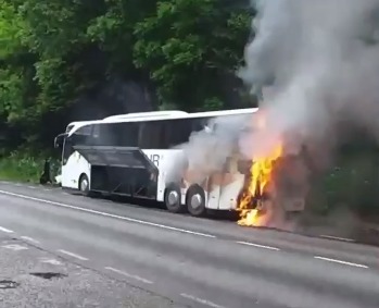 Trafic paralizat pe DN1. Un autocar a fost cuprins de flăcări