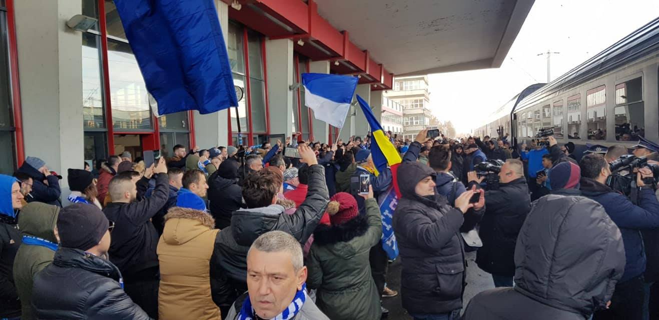 Universitatea Craiova a plecat spre Bucureşti. Fotbaliștii Științei au făcut spectacol în gară