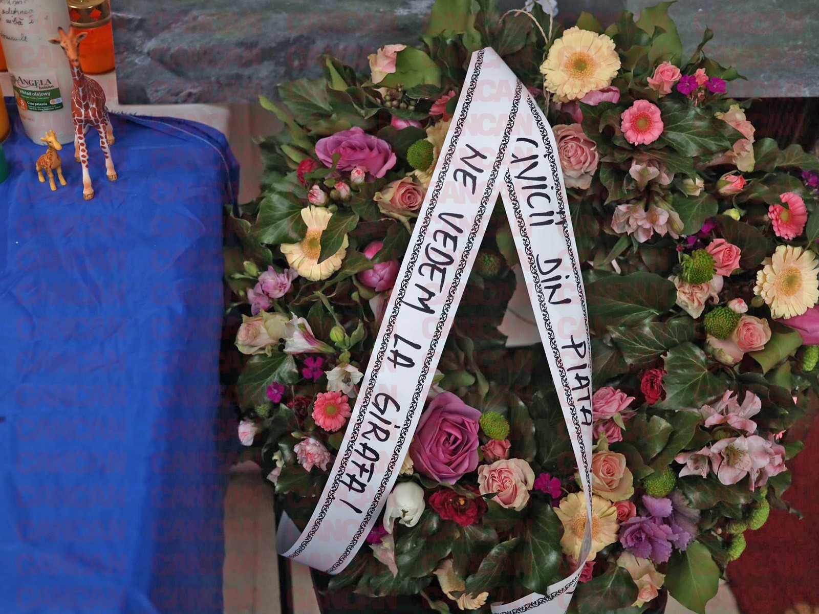 „Vicii din Piața Victoriei. Ne vedem la girafă”, este mesajul scris pe una dintre coroanele depuse la Biserica Albă, în semn de recunoștință pentru toate eforturile pe care filosoful le-a depus pentru a lupta împotriva corupției / foto: CANCAN.RO