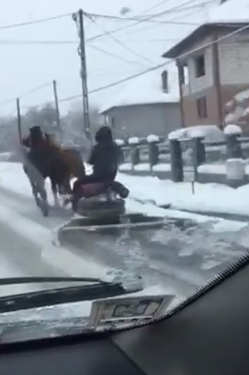 VIDEO INCREDIBIL. Deszăpezire cu calul și plugul, pe drumurile din Băile Olănești