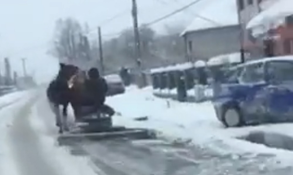 VIDEO INCREDIBIL. Deszăpezire cu calul și plugul, pe drumurile din Băile Olănești