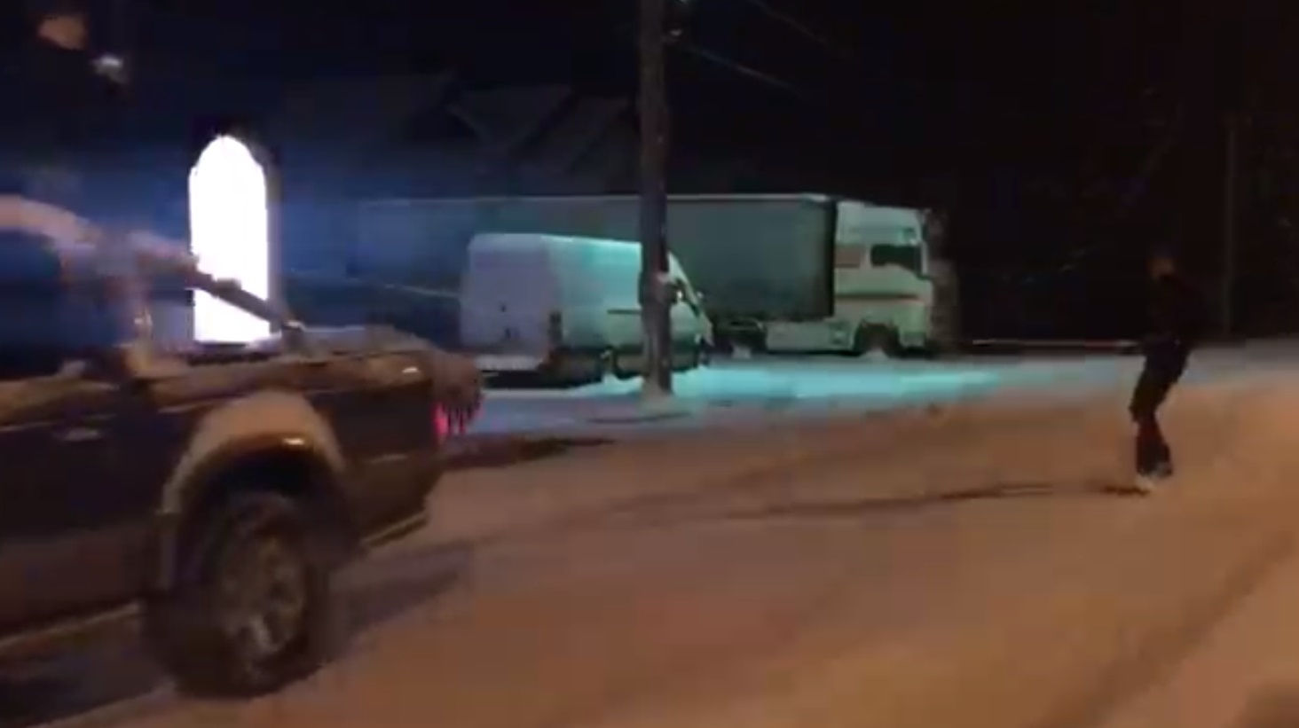 VIDEO. Sport extrem pe o stradă din Motru. S-a dat cu placa, pe zăpadă, tras de o mașină