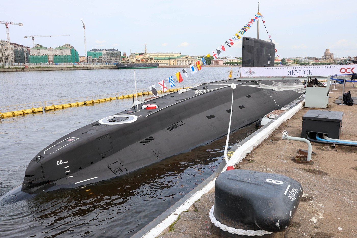 Submarinul diesel-electric „Yakutsk” înainte de ceremonia de ridicare a pavilionului. Submarinul se alătură Marinei ruse. Rusia, Sankt Petersburg, 11 iunie 2025. Foto: Profimedia