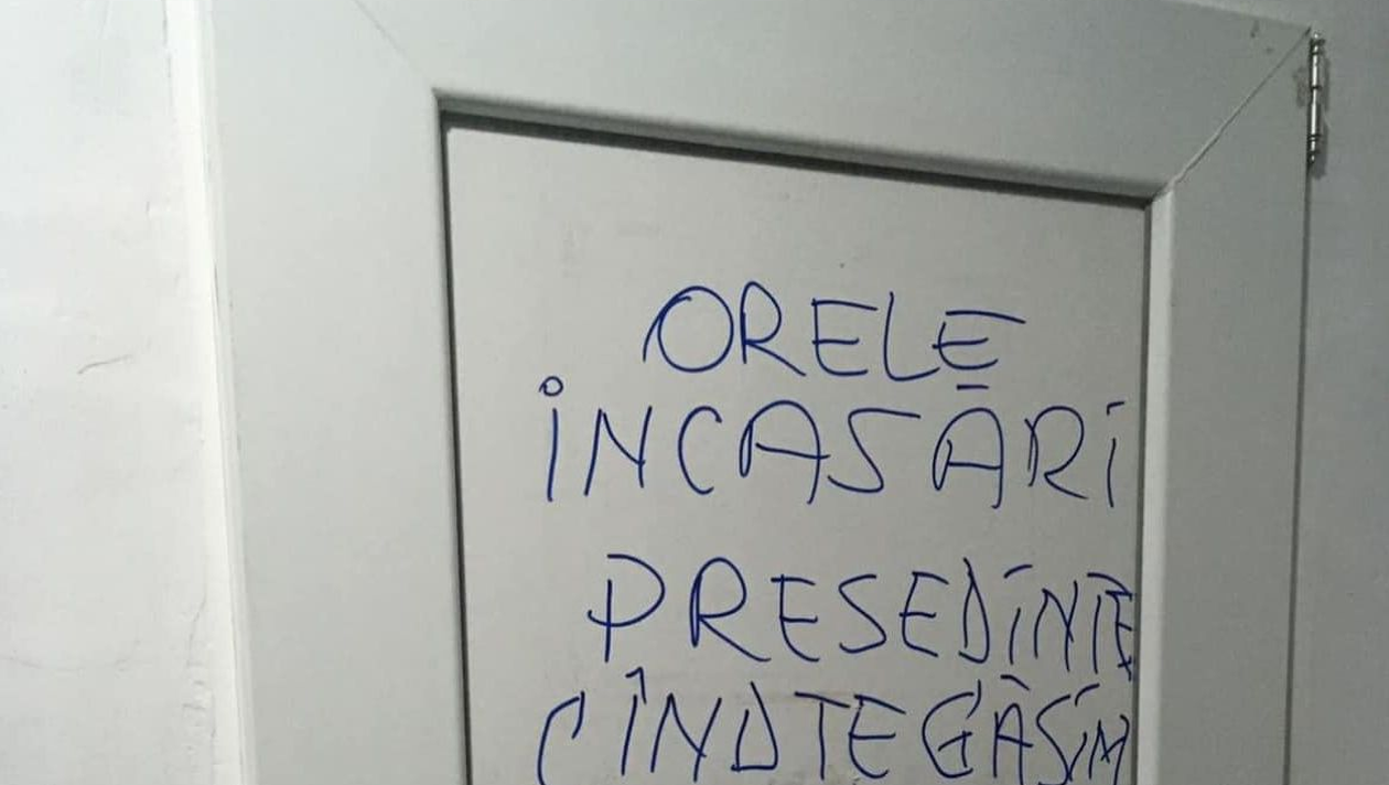 „Orele încasări. Președinte, când te găsim? Justifică banii, 1.000 de lei pe lună. Când ești găsit la Administrație, orele…”, scrie pe ușa de termopan.