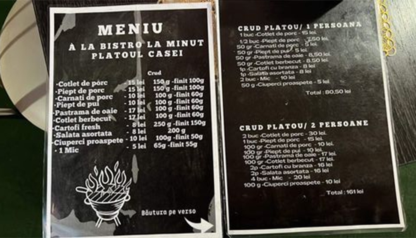 Cotletul de porc 15 lei, cârnații de porc 10 lei, scăricica de porc, pieptul de pui și pulpele de pui tot 15 lei, în timp ce pastrama de oaie și antricoatele de berbecuț sunt 17 lei. Iar pentru a servi un platou ca la carte, e nevoie să combini mai multe tipuri de carne. Astfel, pofticioșii pot opta pentru un platou crud care costă 80,50 lei sau pentru platoul crud pentru două persoane în valoare de 101 lei.