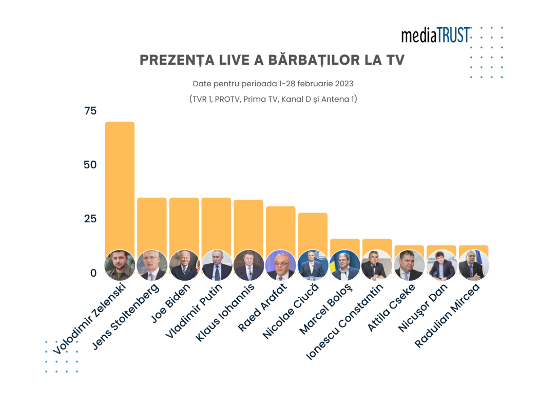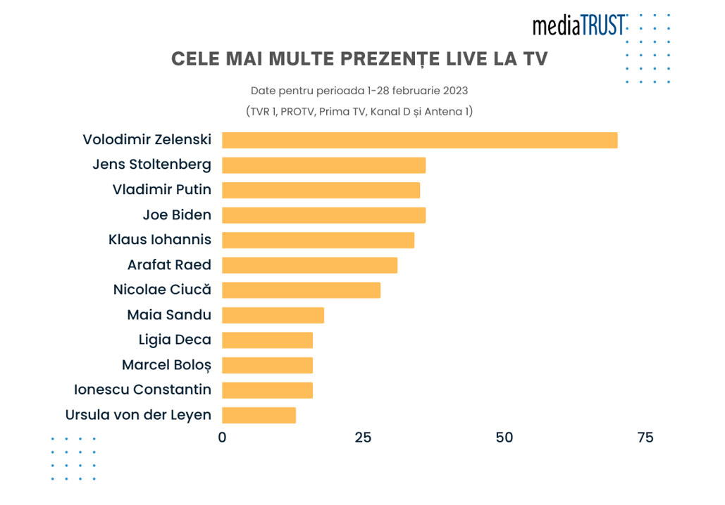 Primul loc este ocupat de Volodimir Zelenski (de 70 ori), urmat de Jens Stoltenberg (36 ori) la egalitate cu Joe Biden (36 ori), urmați de Vladimir Putin (35 ori). Pe poziția 4 este Klaus Iohannis (34 ori), Raed Arafat (de 31 ori), Nicolae Ciucă (de 28 ori), Marcel Boloş (de 16 ori), la egalitate cu Ionescu Constantin – director INFP. Urmează în top Attila Cseke, Nicuşor Dan și Radulian Mircea -cercetator științific (de câte 13 ori).