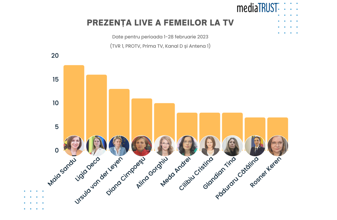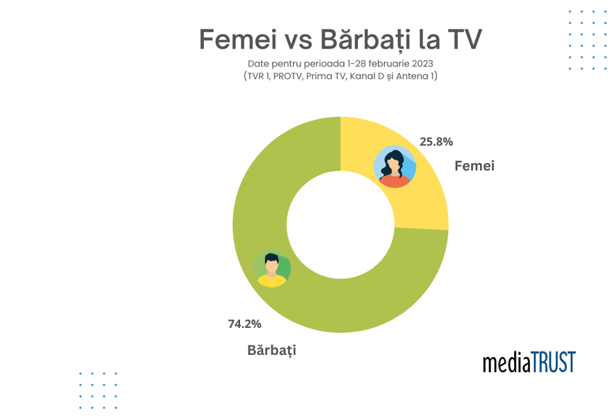 Analiza prezenței femeilor la cele mai importante posturi de televiziune din țară demonstrează, încă o dată, că egalitatea de gen este încă departe de a fi atinsă în mass-media. MediaTRUST a analizat un total de 1,641 de materiale ale principalelor buletine de știri ale zilei difuzate de posturile TVR 1, PROTV, Prima TV, Kanal D și Antena 1, în perioada 1-28 februarie 2023. Astfel, în urma analizei detaliate, a fost confirmată o prezență scăzută a femeilor în calitate de experți, autorități, comentatori sau invitați în principalele ediții de știri TV.