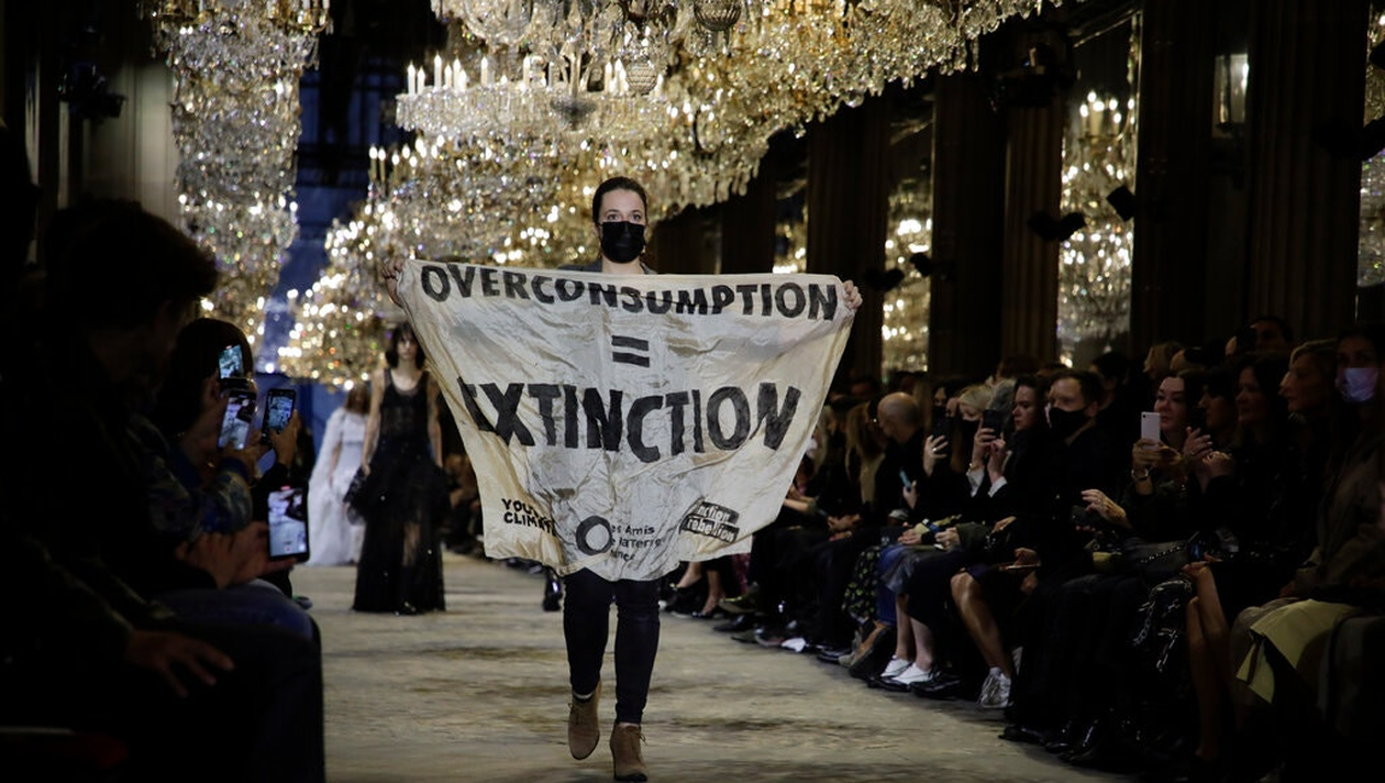 PARIS – Un activist al climei, purtând un banner alb cu cuvintele „Supraconsum = Extincție” în litere îngroșate, s-a alăturat modelelor de pe pistă pentru spectacolul Louis Vuitton de la muzeul Luvru, evenimentul final al Săptămânii modei de la Paris .