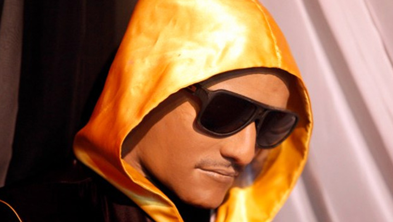 Imbracat in sort si o bluza de trening cu gluga, cu manusi de box si cu ochelari de soare, sportivul a fost pus intr-un colt al rigului, in timp ce in mijloc a fost asezata o lumanare aprinsa.