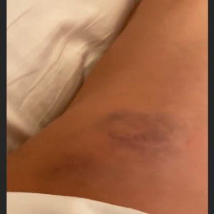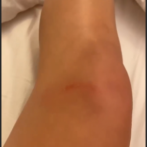 „Când am spus că mă doare … uitați-vă ce minunăție de vânătaie mi-am făcut. Plus că este și foarte umflată zona, plus genunchiul” , s-a plâns vedeta pe Instagram.
