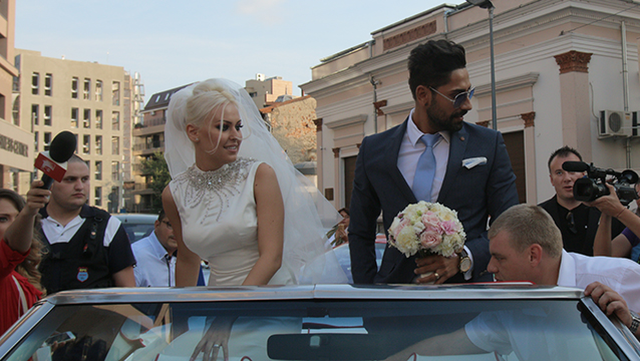 In spatele masinii care i-a dus pe miri la restaurantul de lux din nordul Capitalei au fost legate mai multe cutii goale de conserve. Din autoturism, Connect-R si Misha le-au facut cu mana celor care ii asteptau in fata localului, de parca ar fi fost la o adevarata baie de multime.