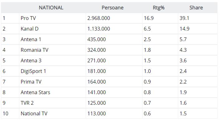 Pro TV a fost la diferență uriașă fața marile rivale Kanal D și Antena 1. Postul TV a avut cifre duble față de Kanal D și de aproape șapte ori mai mulți privitori decât Antena 1.