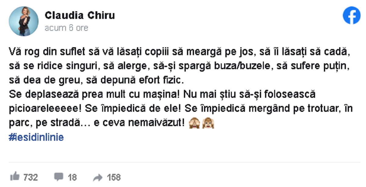 „Vă rog din suflet să vă lăsați copiii să meargă pe jos, să îi lăsați să cadă, să se ridice singuri, să alerge, să-și spargă buza/buzele, să sufere puțin, să dea de greu, să depună efort fizic. Se deplasează prea mult cu mașina! Nu mai știu să-și folosească picioareleeeee! Se împiedică de ele! Se împiedică mergând pe trotuar, în parc, pe stradă… e ceva nemaivăzut!”, a scris aceasta pe Facebook.