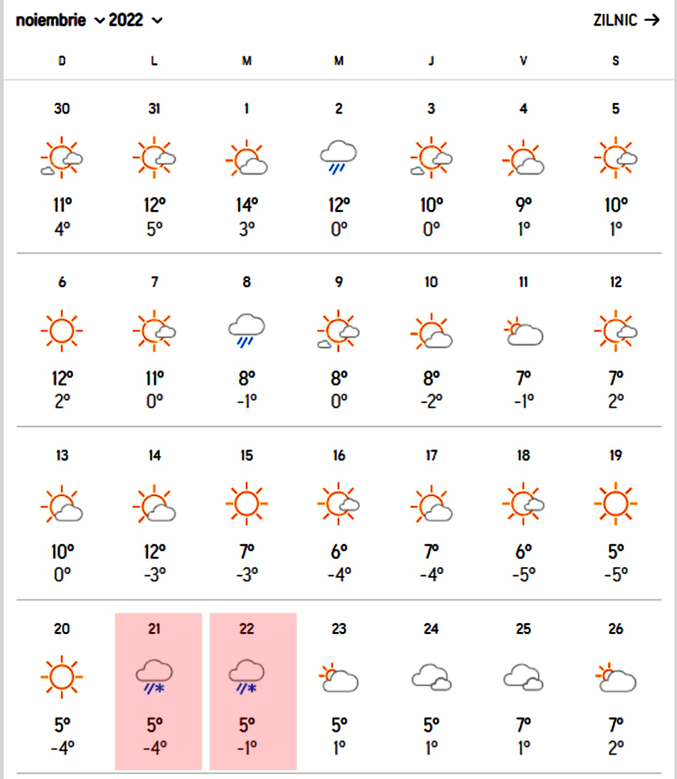 Astfel, la Brașov vor apărea primii fulgi de zăpadă la finalul lunii noiembrie, mai exact pe 21 și 22. Atunci meteorologii au anunțat temperaturi de maxim 5 grade pe timpul zilei, iar pe timpul nopții temperaturile vor ajunge chiar și la -4 grade Celsius.