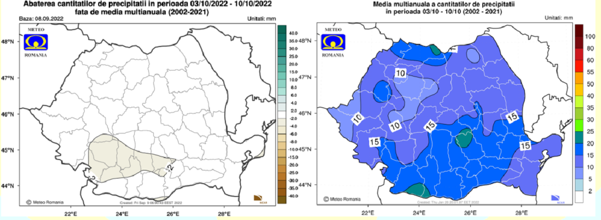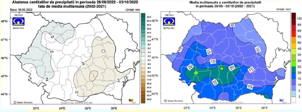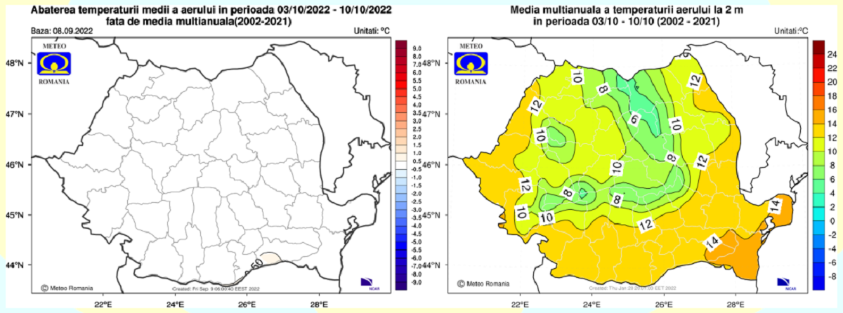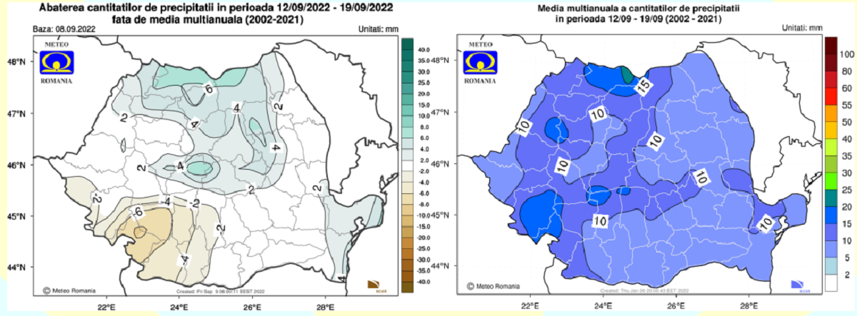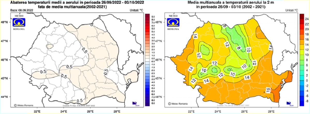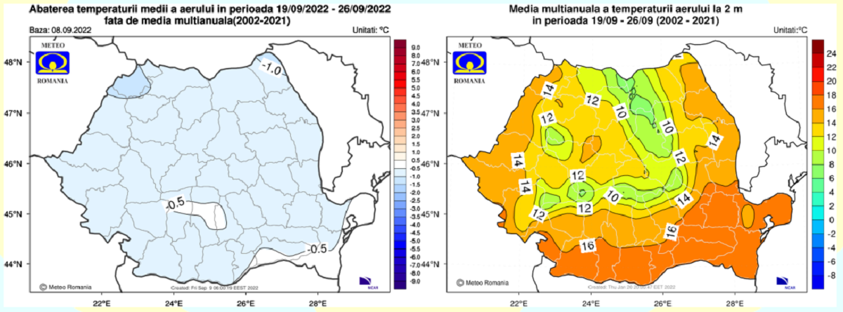 În săptămâna 12.09 – 19.09. 2022 valorile termice vor fi ușor mai coborâte decât cele normale pentru această săptămână, pe întreg teritoriul României, dar mai ales în regiunile nordice, centrale și nord-estice.
