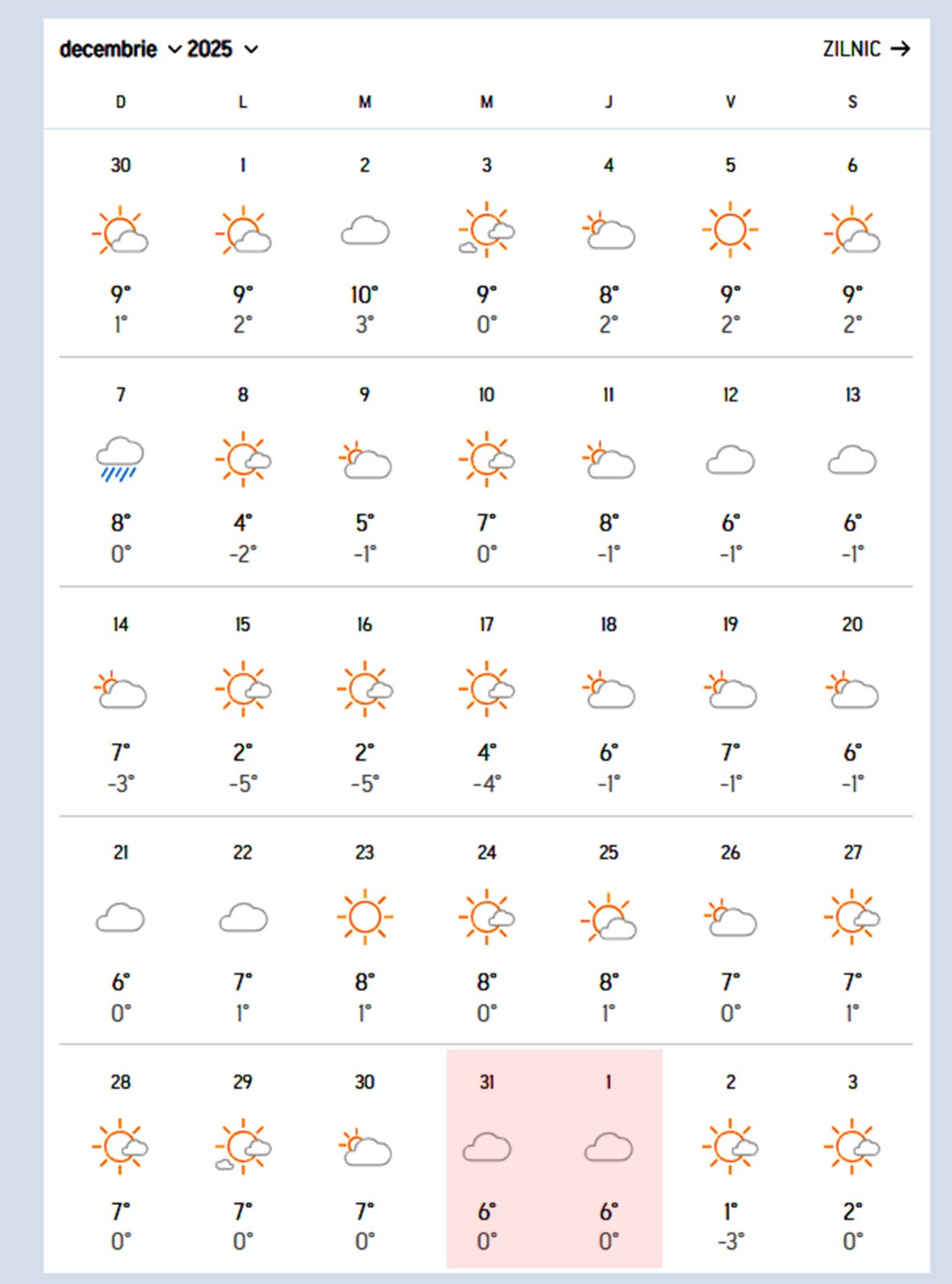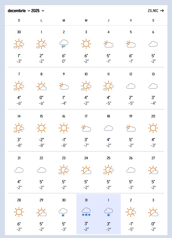 În București, condițiile meteo vor fi stabile, fără ploi sau ninsori, iar temperaturile se vor situa între 6 și 0 grade Celsius, atât pe 31 decembrie, cât și pe 1 ianuarie. Aceeași situație este așteptată și în majoritatea zonelor din țară, unde vremea va rămâne relativ blândă pentru finalul de an.